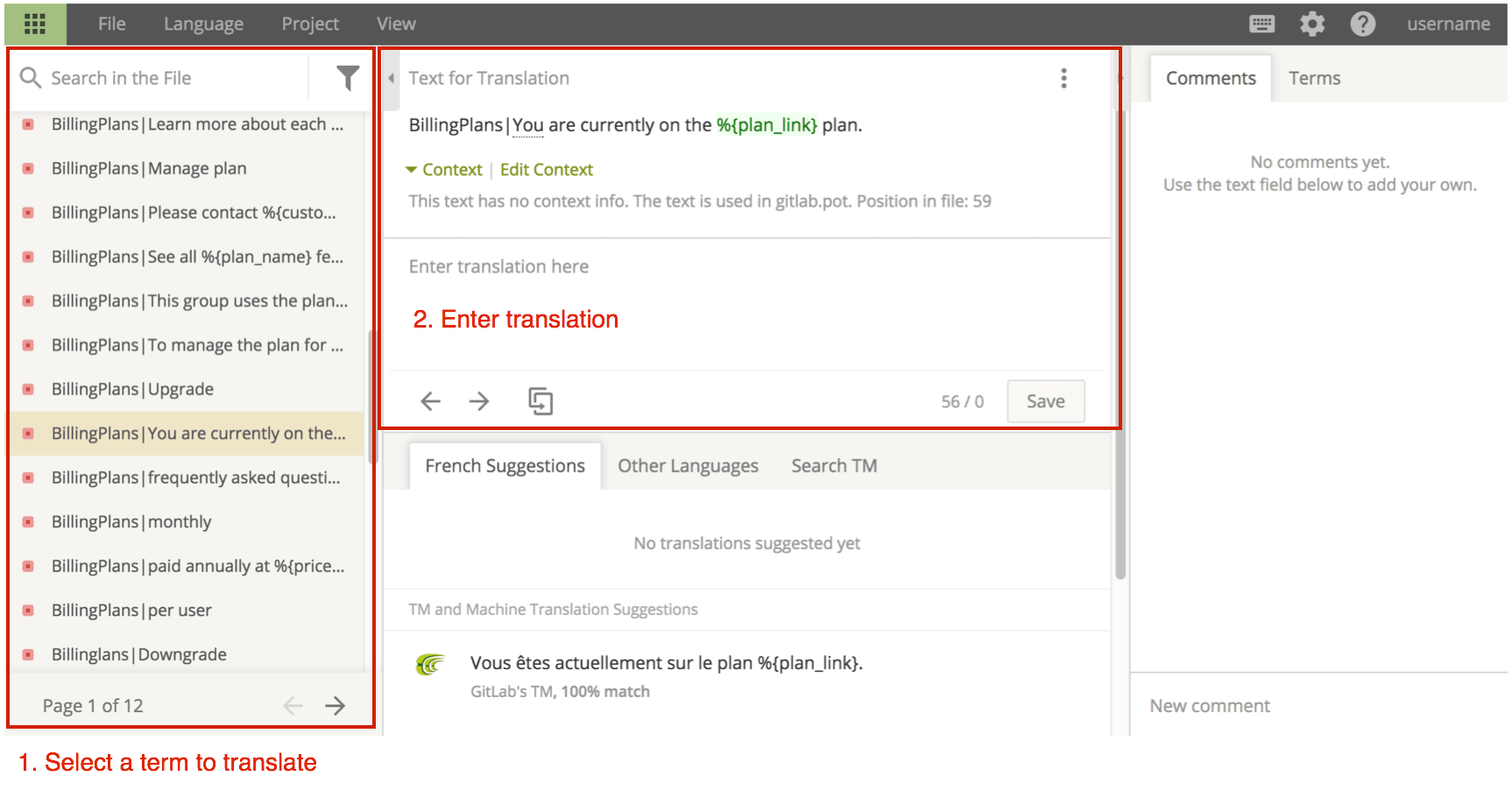 A glossary of common terms is available in the right panel by clicking Terms. Comments can be added to discuss a translation with the community.